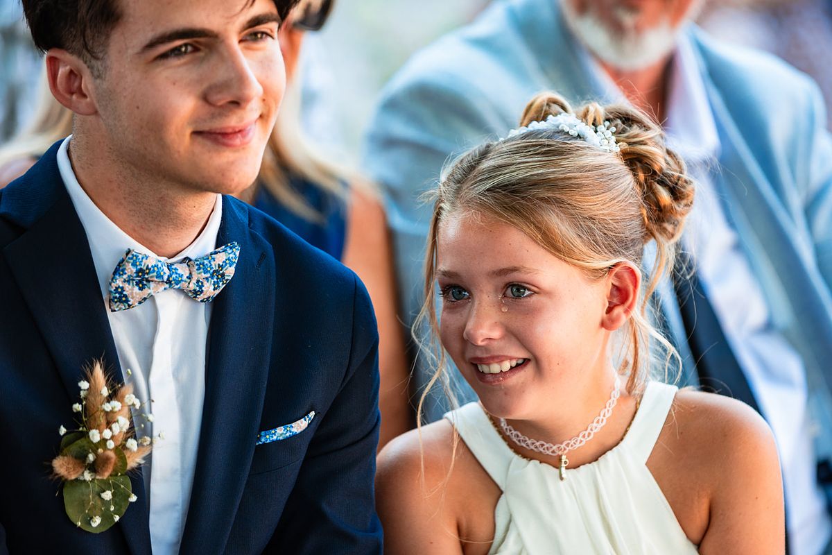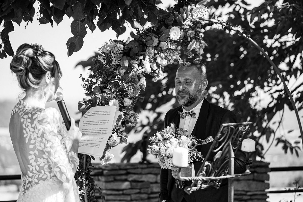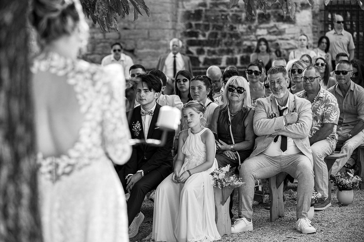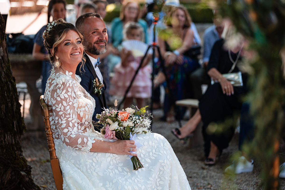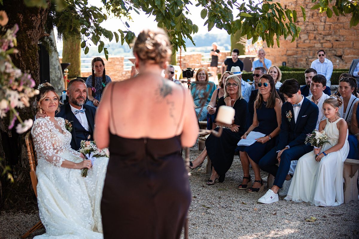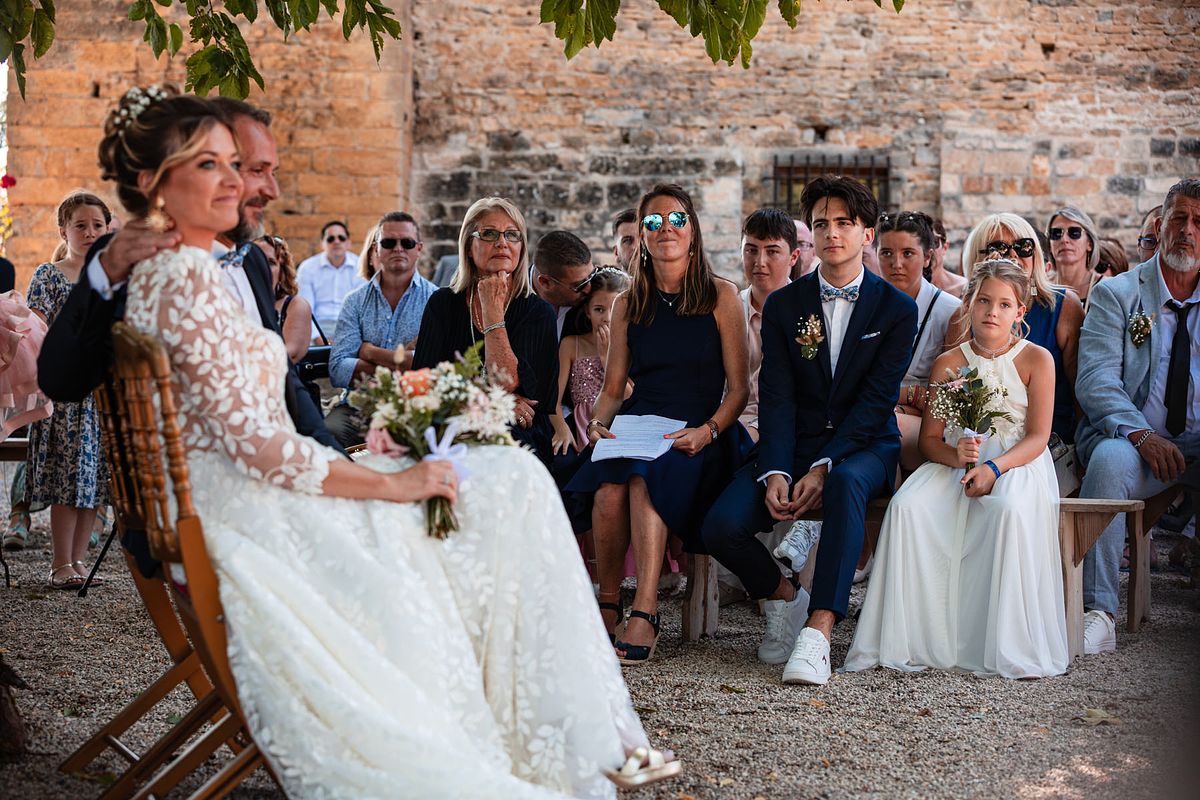 En pensant au mariage de Sandrine et Christophe, deux choses me viennent en tête de manière foudroyante …. La température extrême ce jour-ci avec une cérémonie laïque mi ombragée mi sous un soleil brûlant !! Et la deuxième chose c’est l’émotion de leurs enfants et notamment de la fille de Sandrine qui me fit forcément penser aux deux miennes !!