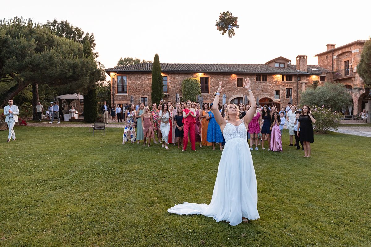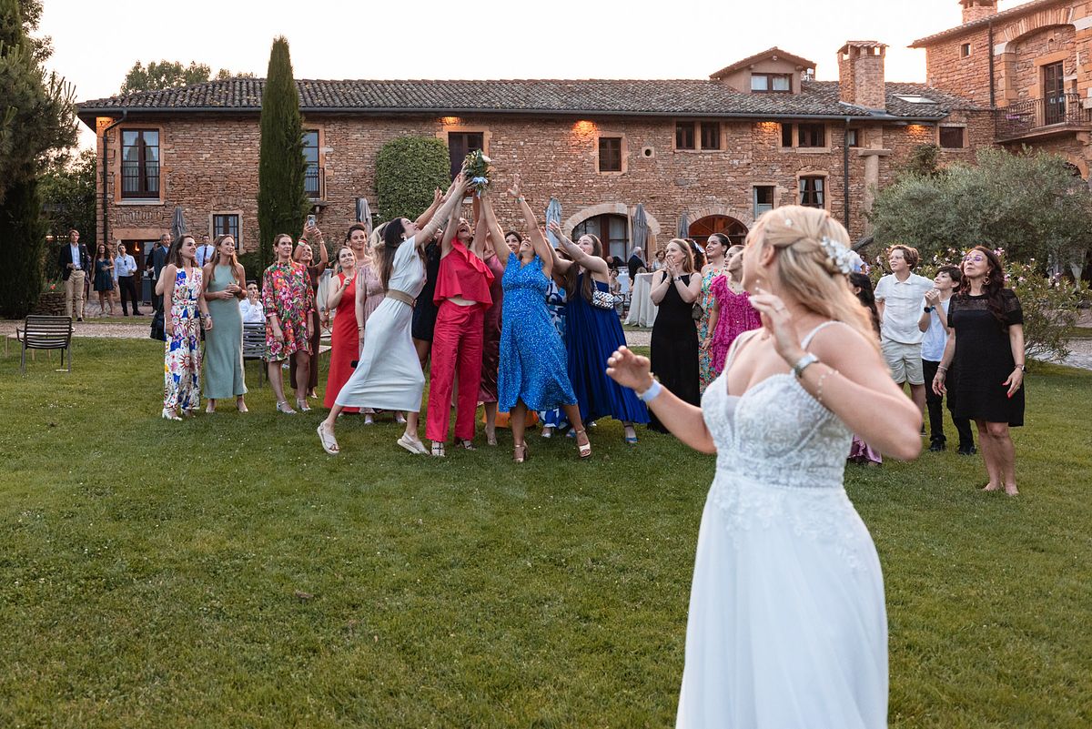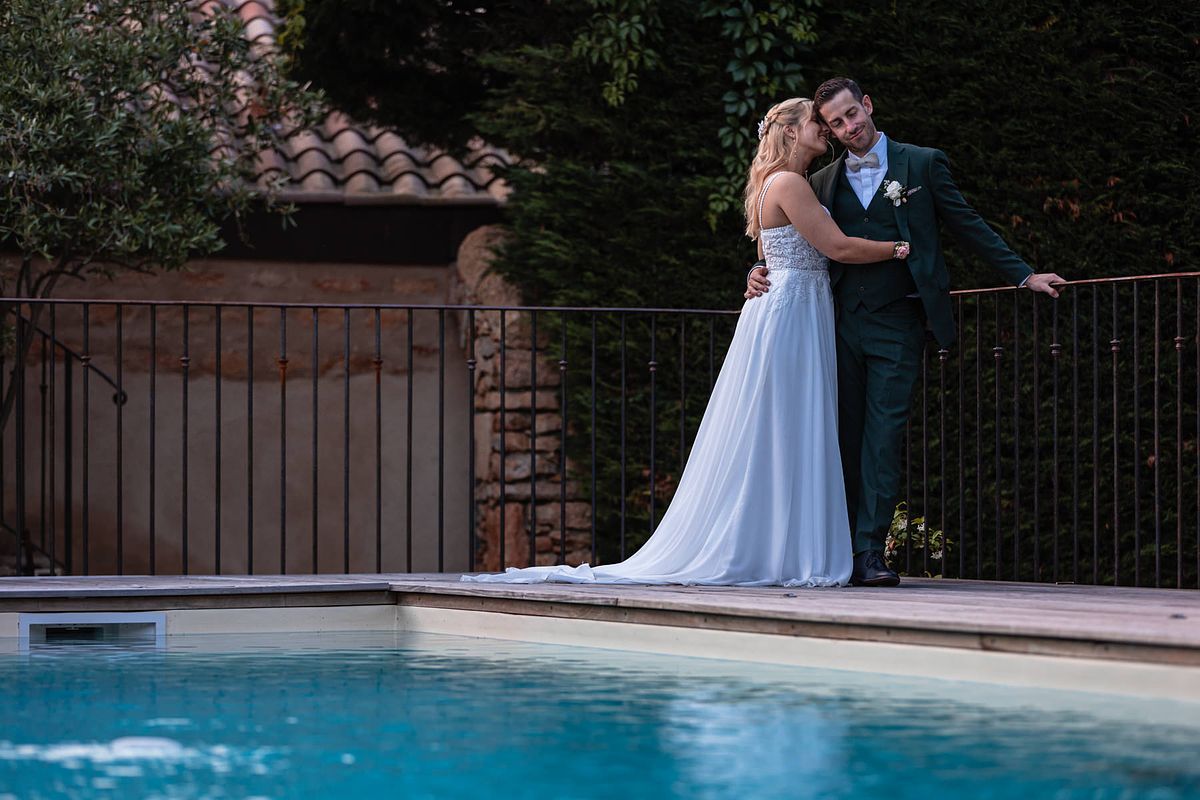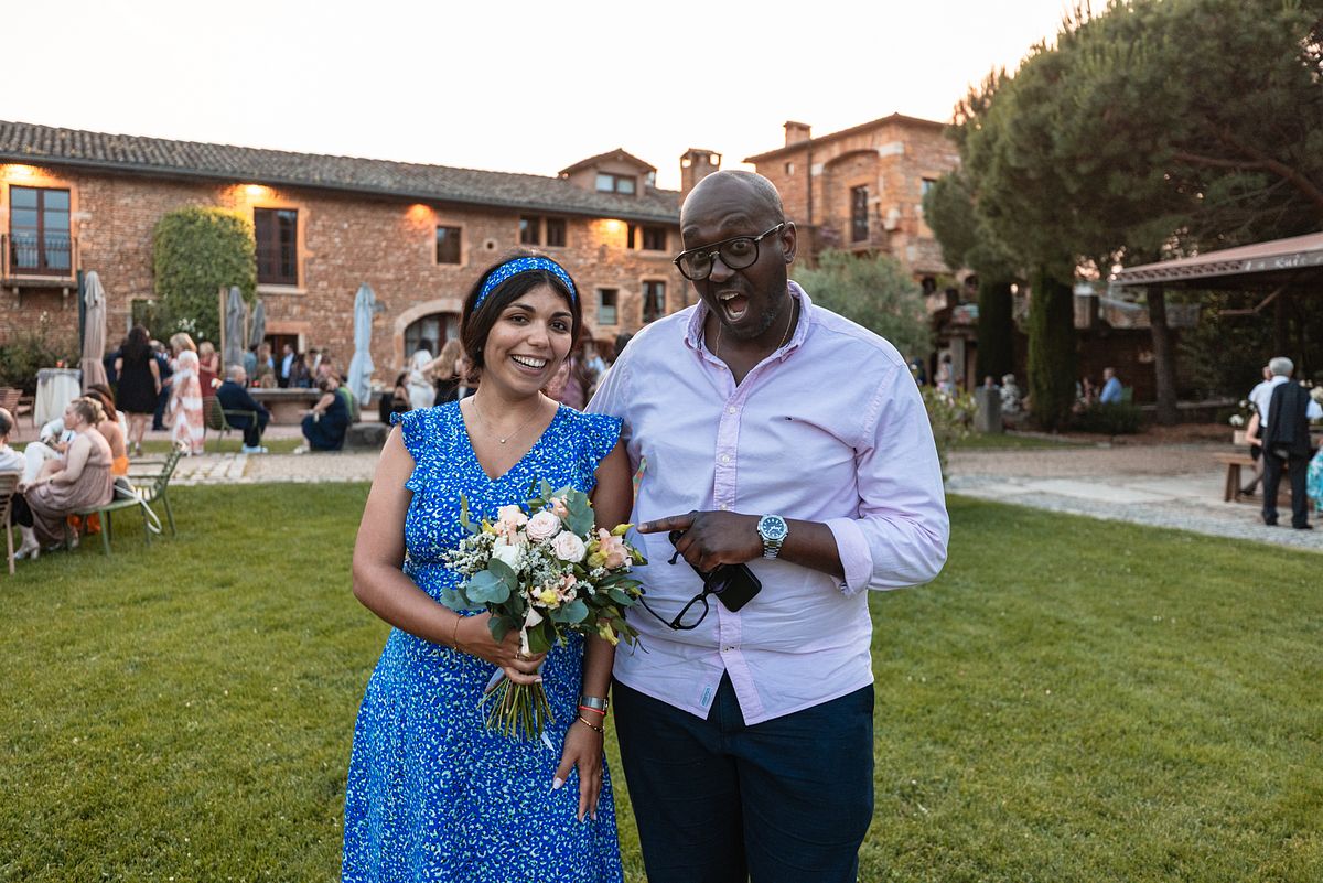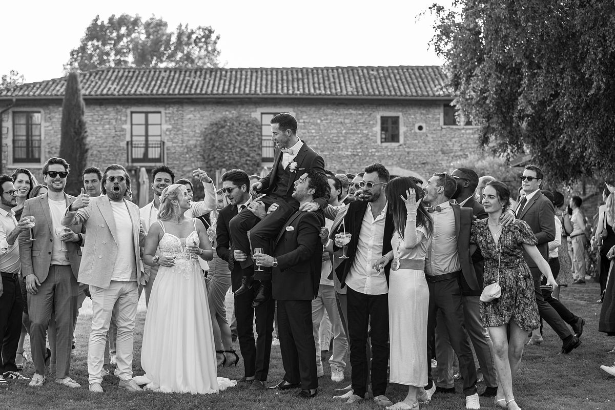 Au coucher du soleil, une parenthèse plus intime a permis de réaliser les photos de couple dans la pierre dorée, baignées par une lumière douce qui sublimait la robe d’Albane et le costume d’Anthony. Puis la soirée a pris des allures de grande fête : lancer de bouquet endiablé, groupe d’amis portant le marié, rires, chants et embrassades jusqu’à la nuit tombée, comme on les aime sur un mariage festif près de Lyon.