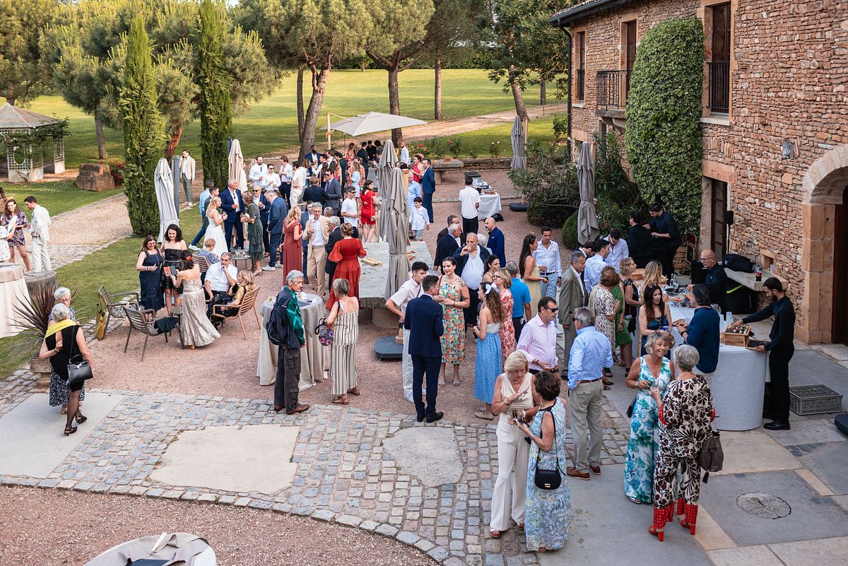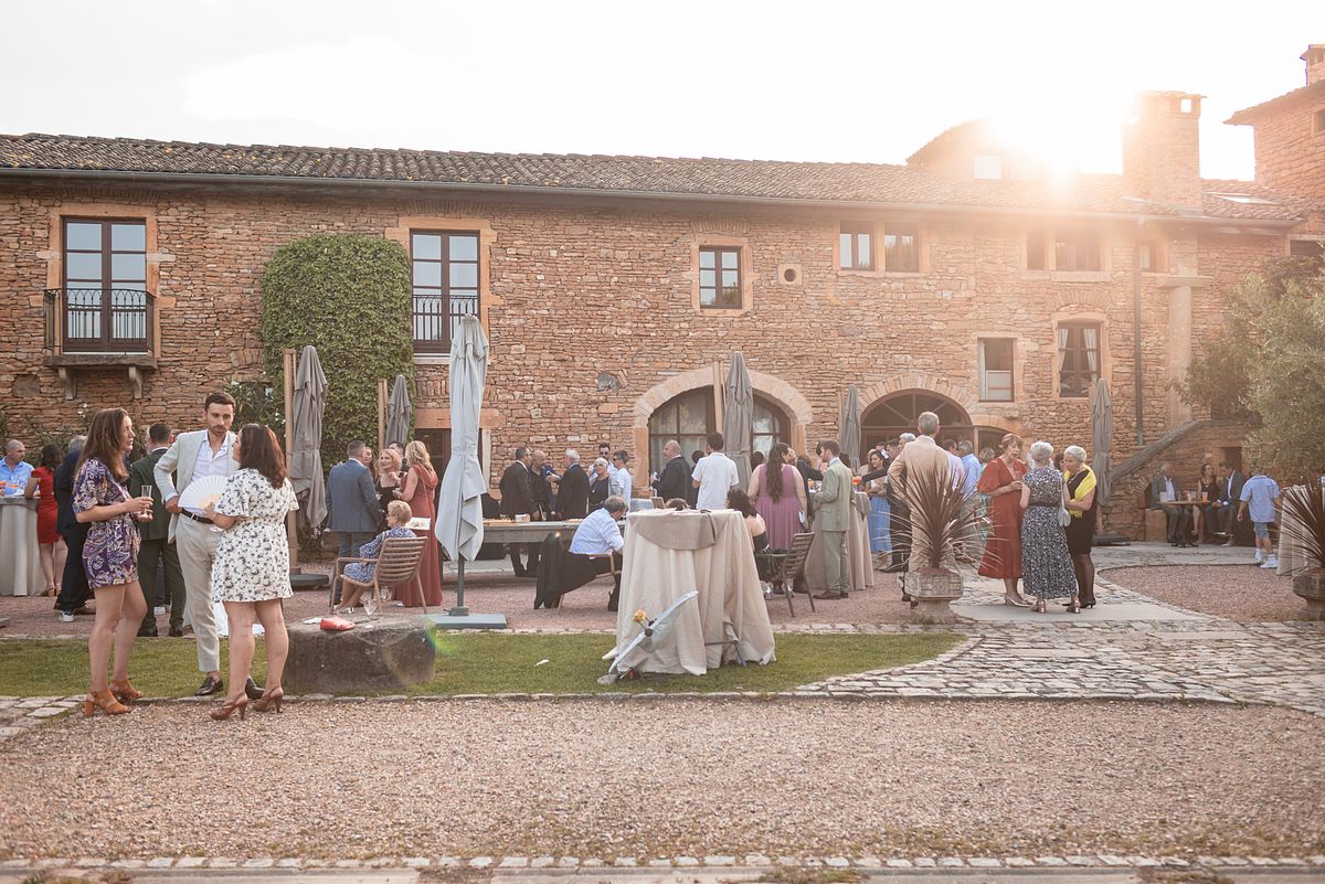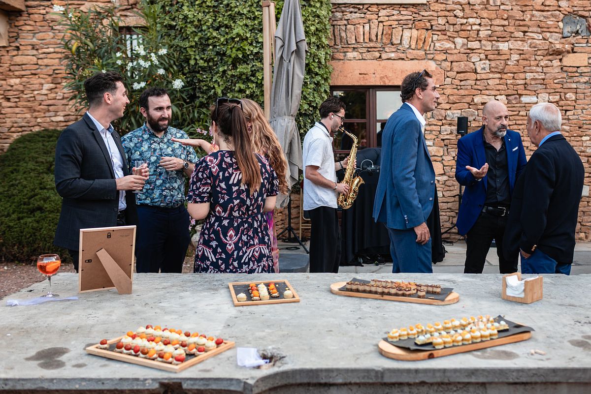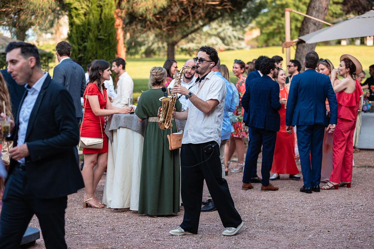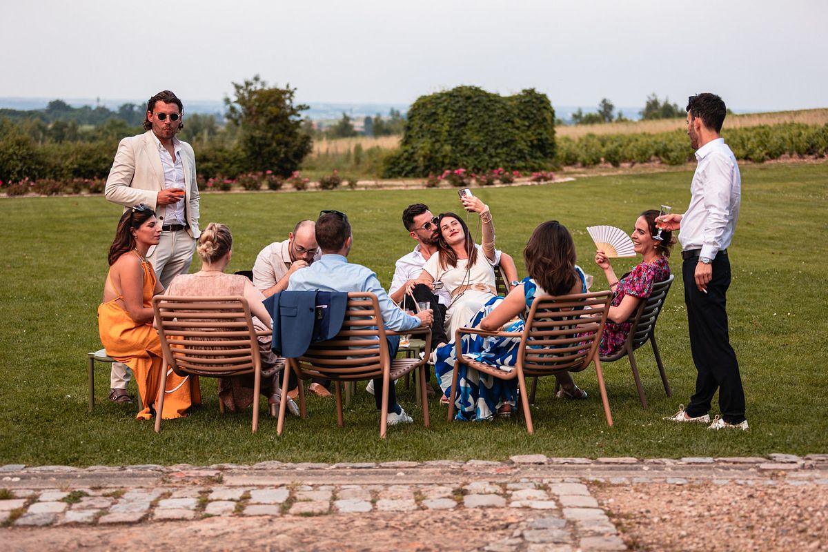 Après le “oui”, place au cocktail façon garden party sur la pelouse du domaine, avec vue sur la campagne beaujolaise. Invités installés en petits groupes, verres colorés à la main, saxophoniste qui déambule et show culinaire improvisé par les chefs : une ambiance dolce vita, élégante et conviviale, parfaite pour un reportage photo naturel et spontané.