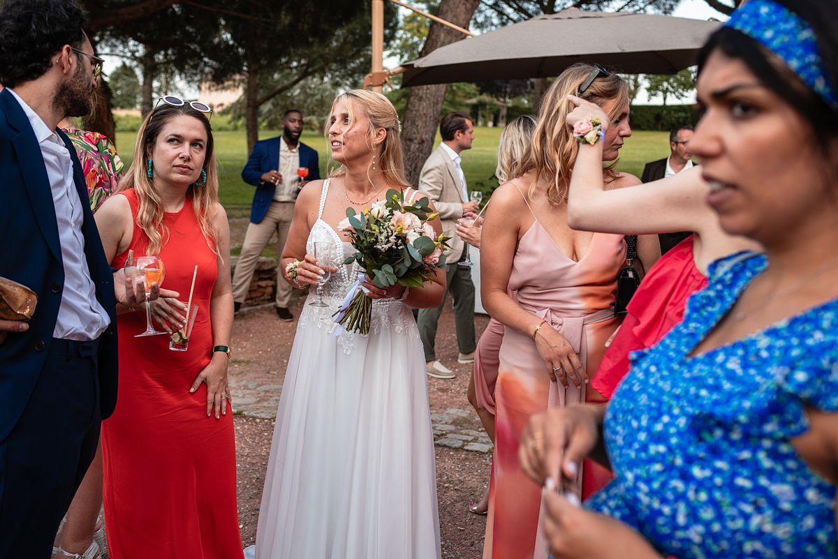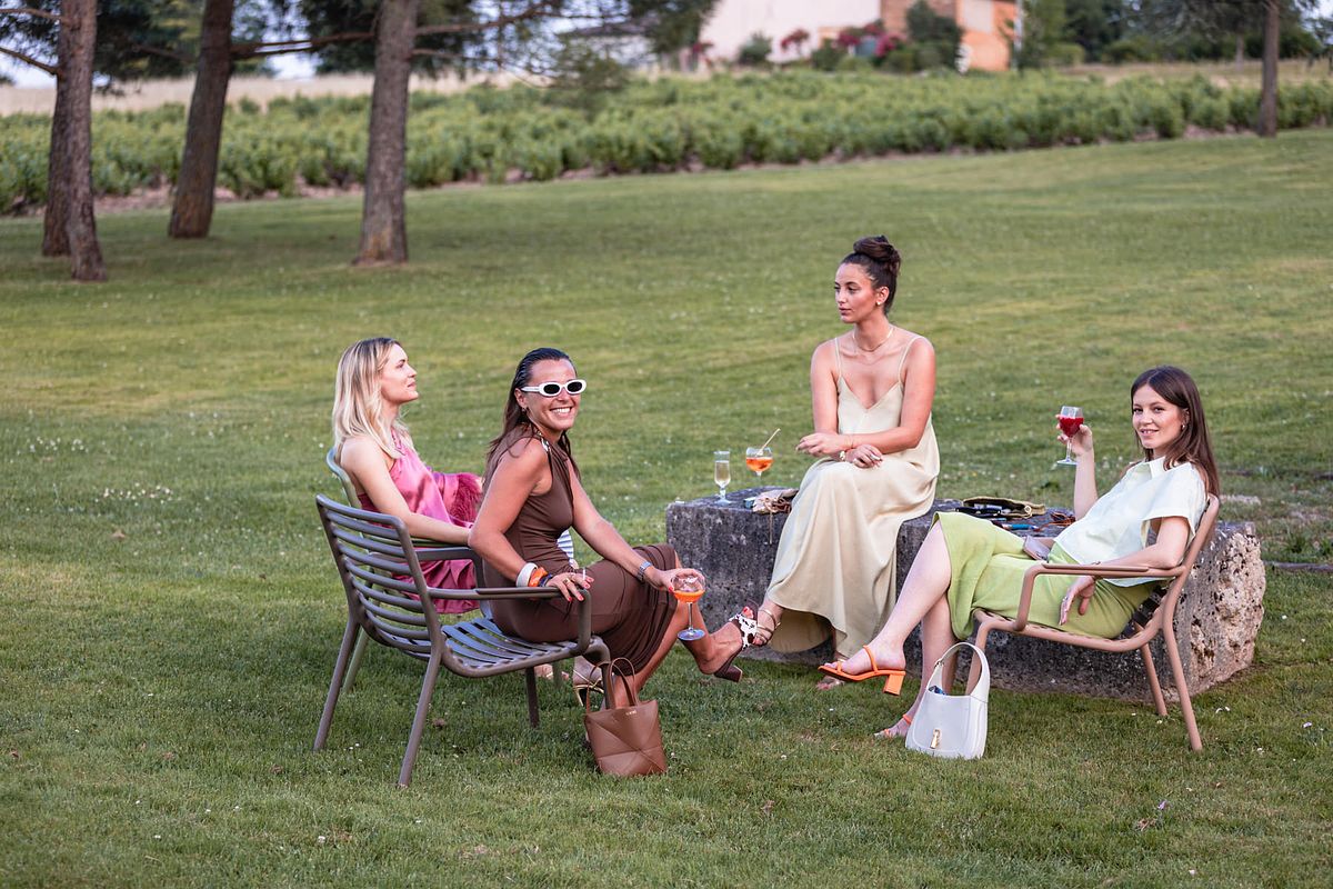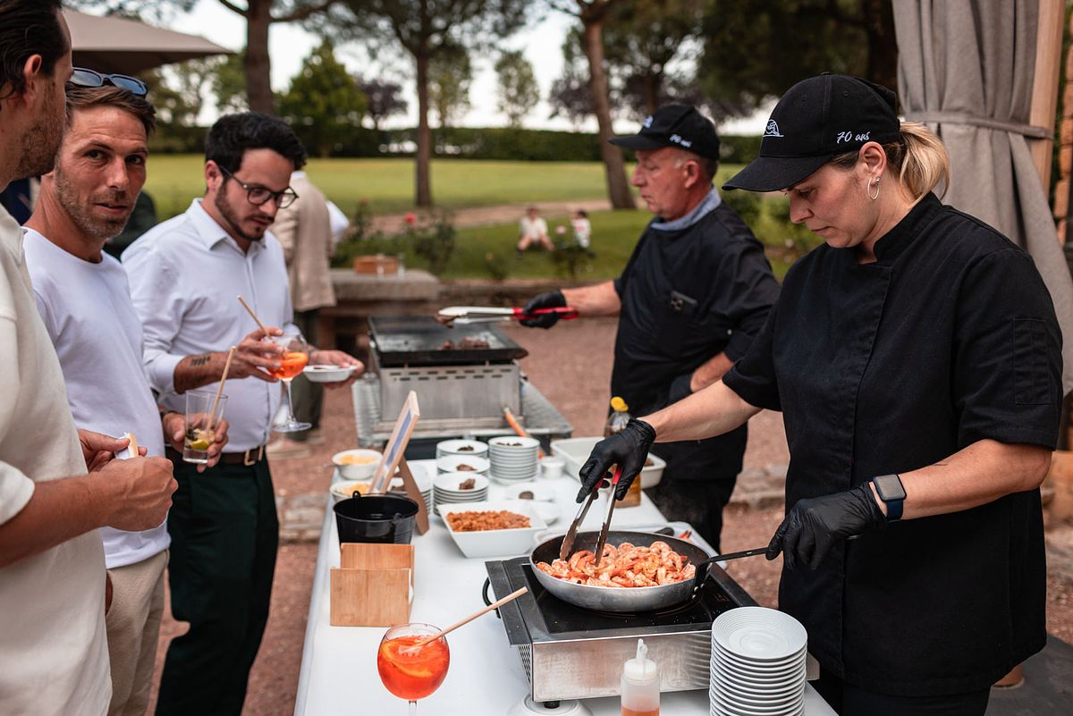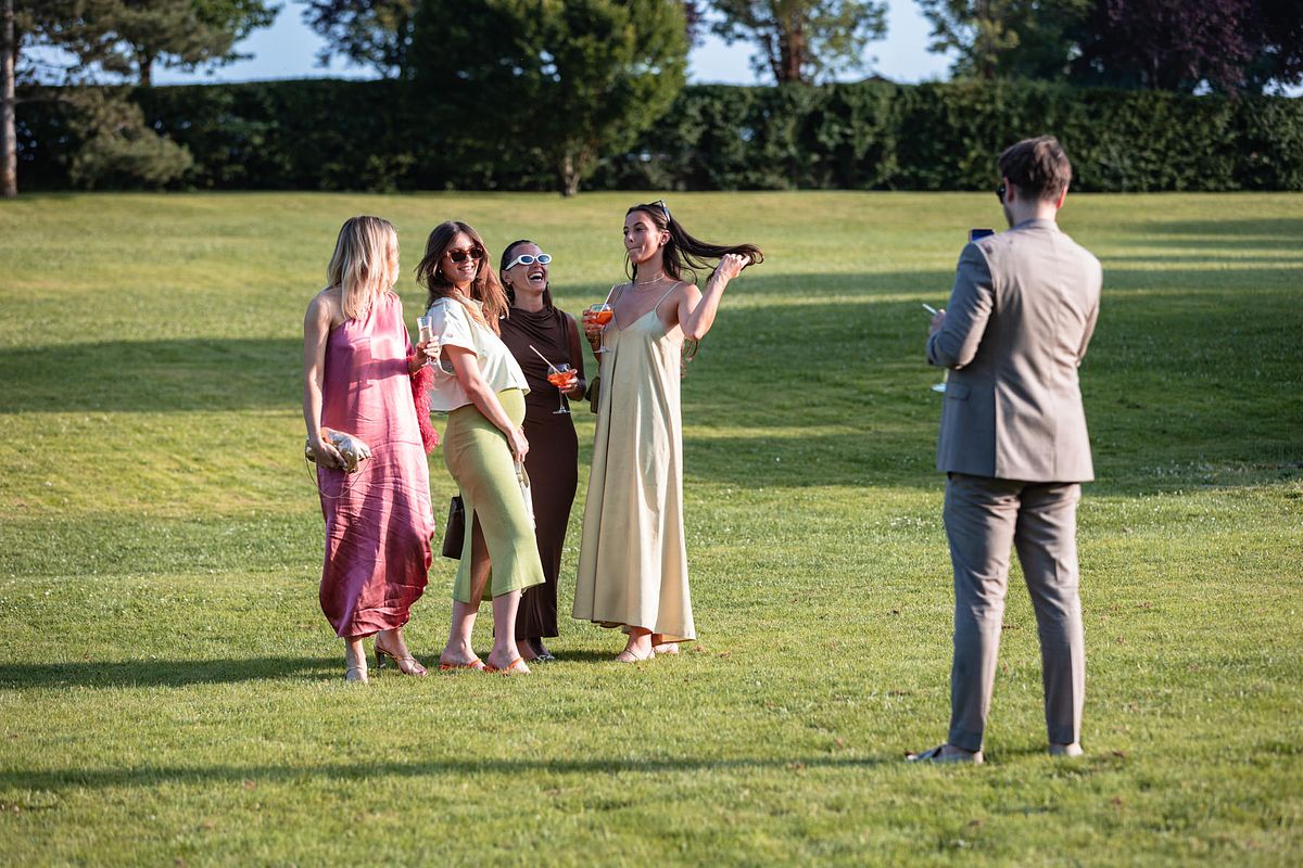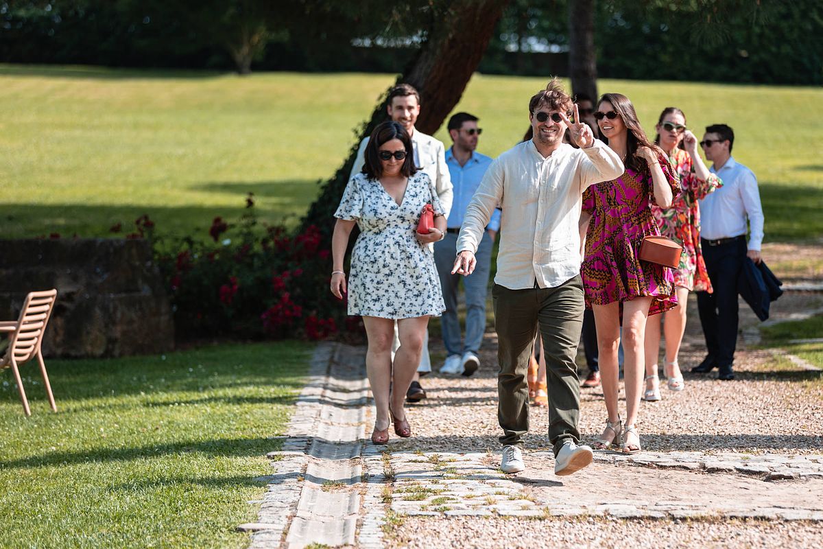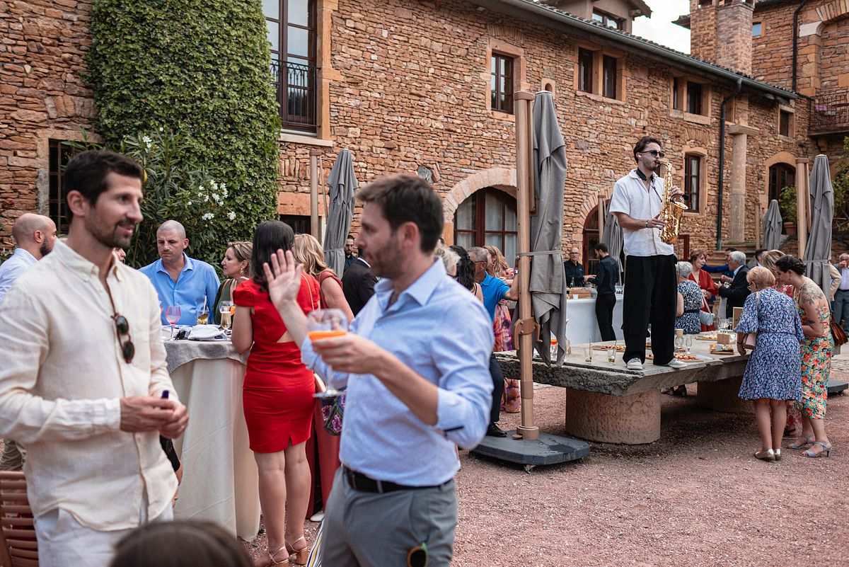 Après le “oui”, place au cocktail façon garden party sur la pelouse du domaine, avec vue sur la campagne beaujolaise. Invités installés en petits groupes, verres colorés à la main, saxophoniste qui déambule et show culinaire improvisé par les chefs : une ambiance dolce vita, élégante et conviviale, parfaite pour un reportage photo naturel et spontané.
