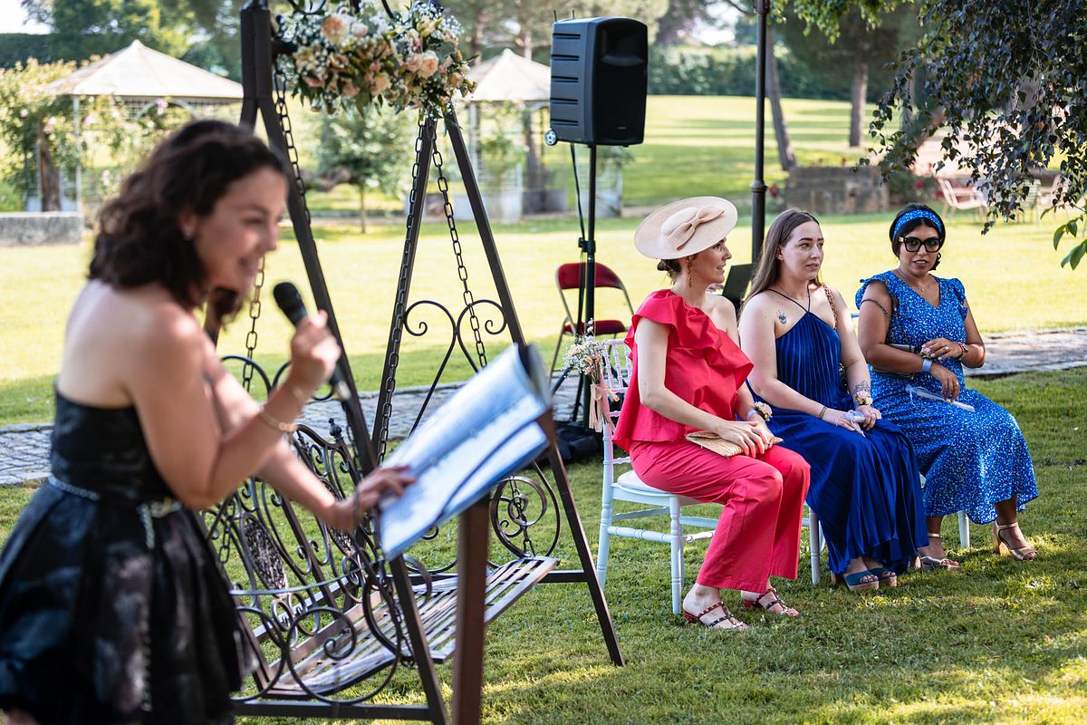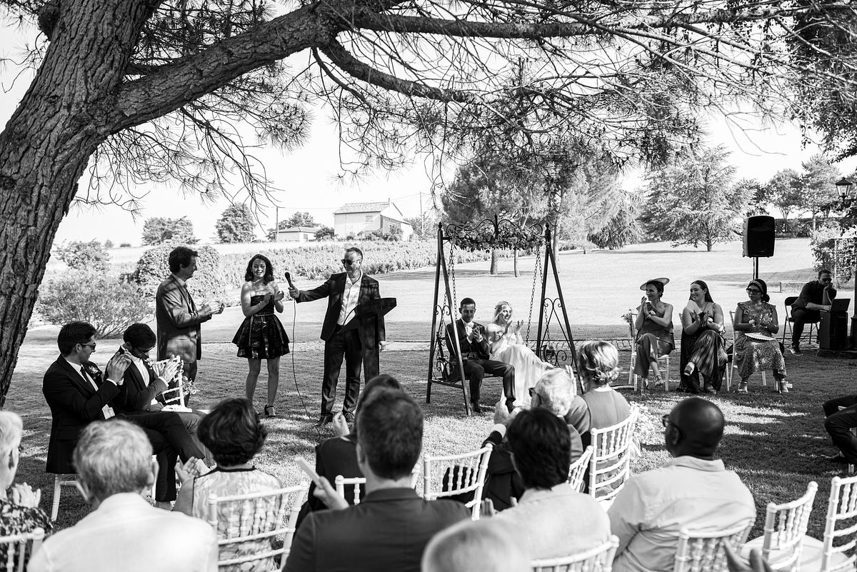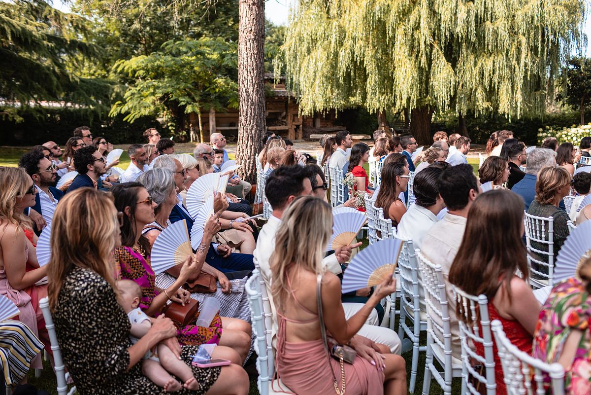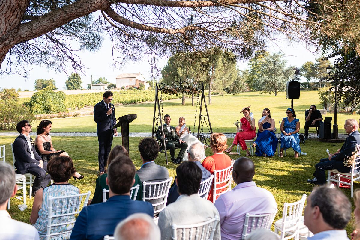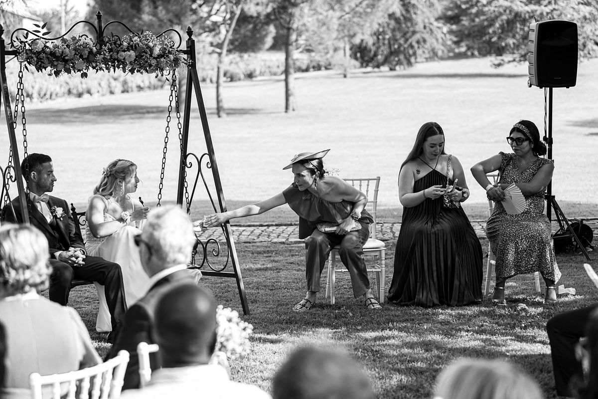 Après le “oui”, place au cocktail façon garden party sur la pelouse du domaine, avec vue sur la campagne beaujolaise. Invités installés en petits groupes, verres colorés à la main, saxophoniste qui déambule et show culinaire improvisé par les chefs : une ambiance dolce vita, élégante et conviviale, parfaite pour un reportage photo naturel et spontané.