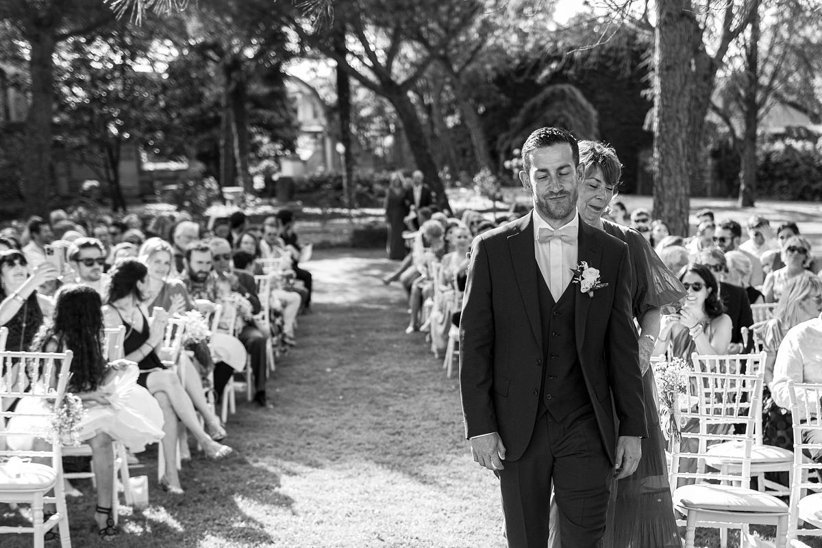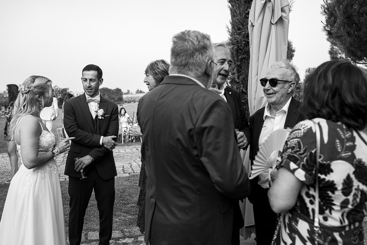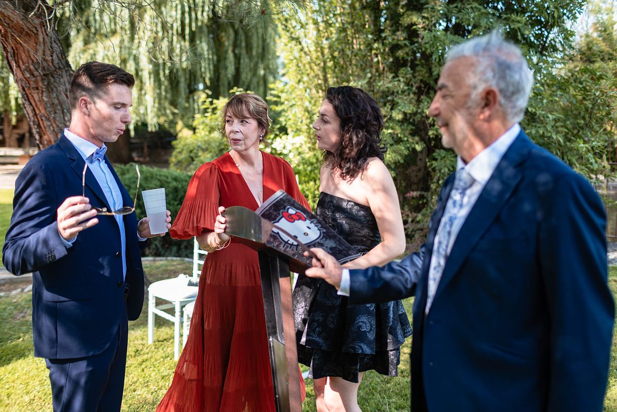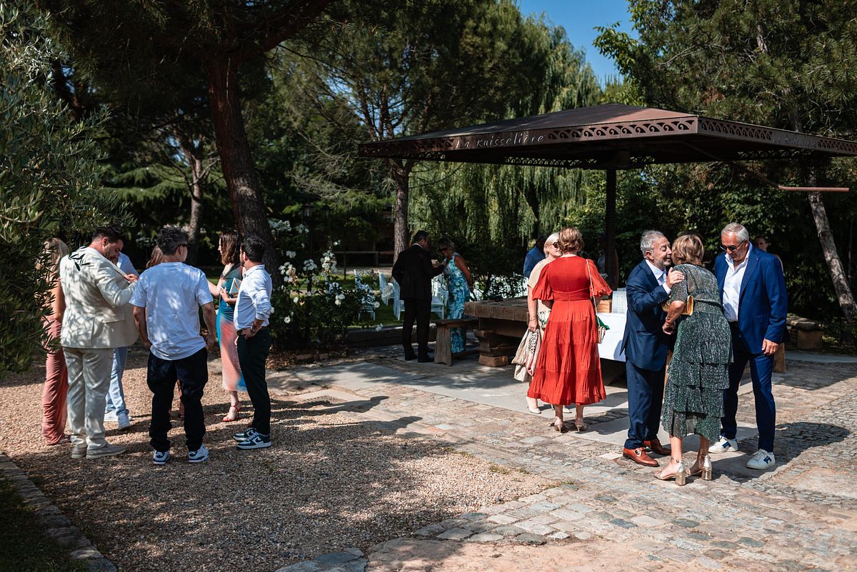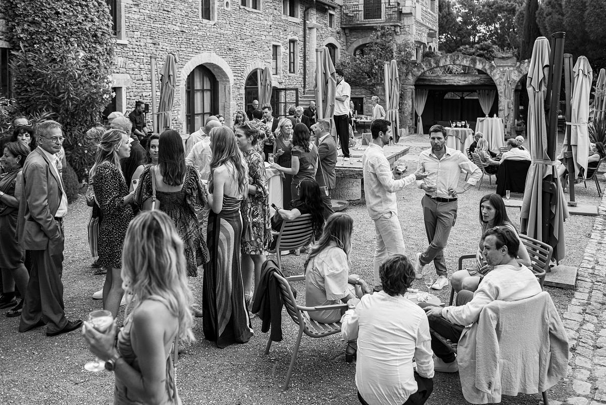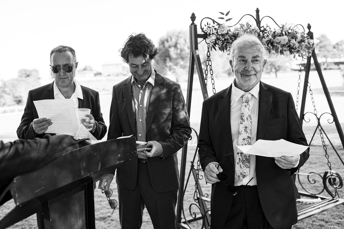 Après le “oui”, place au cocktail façon garden party sur la pelouse du domaine, avec vue sur la campagne beaujolaise. Invités installés en petits groupes, verres colorés à la main, saxophoniste qui déambule et show culinaire improvisé par les chefs : une ambiance dolce vita, élégante et conviviale, parfaite pour un reportage photo naturel et spontané.