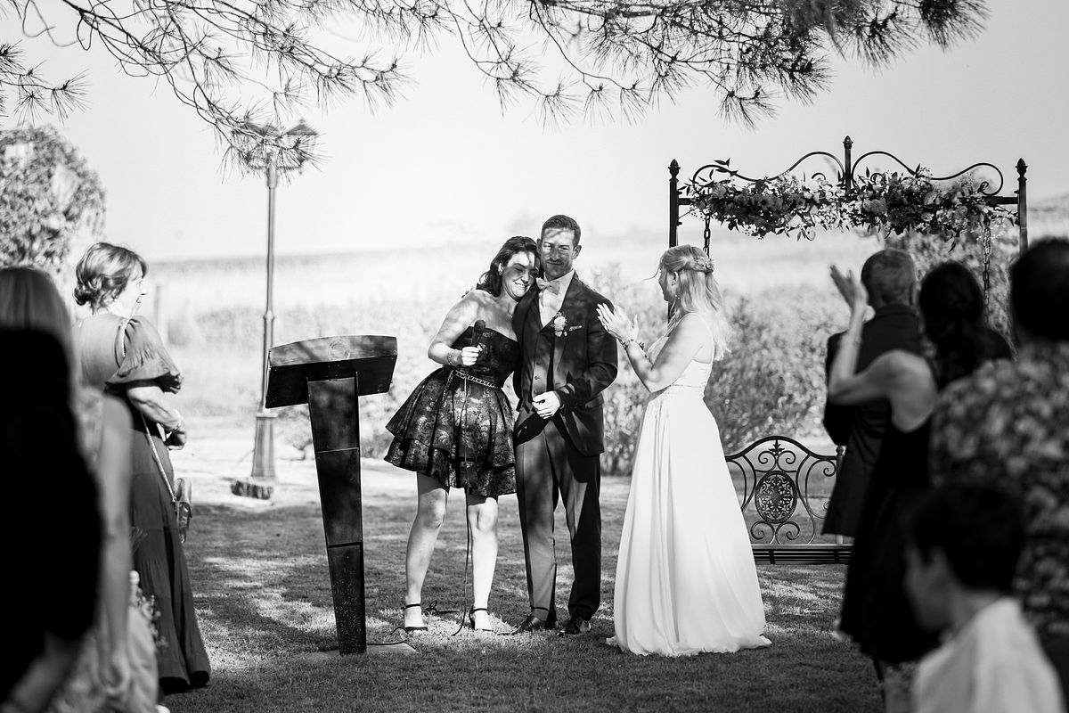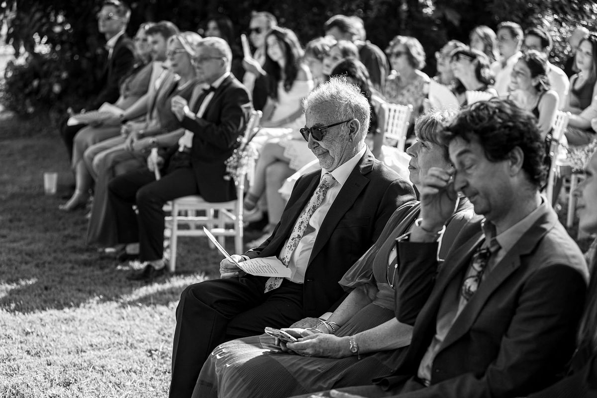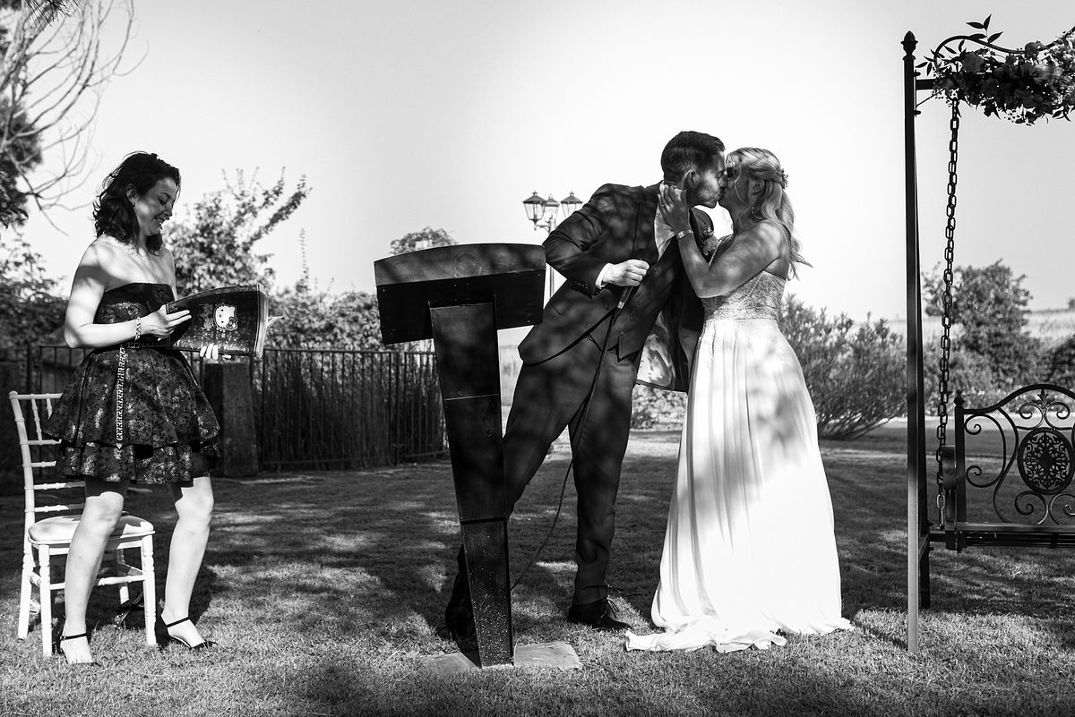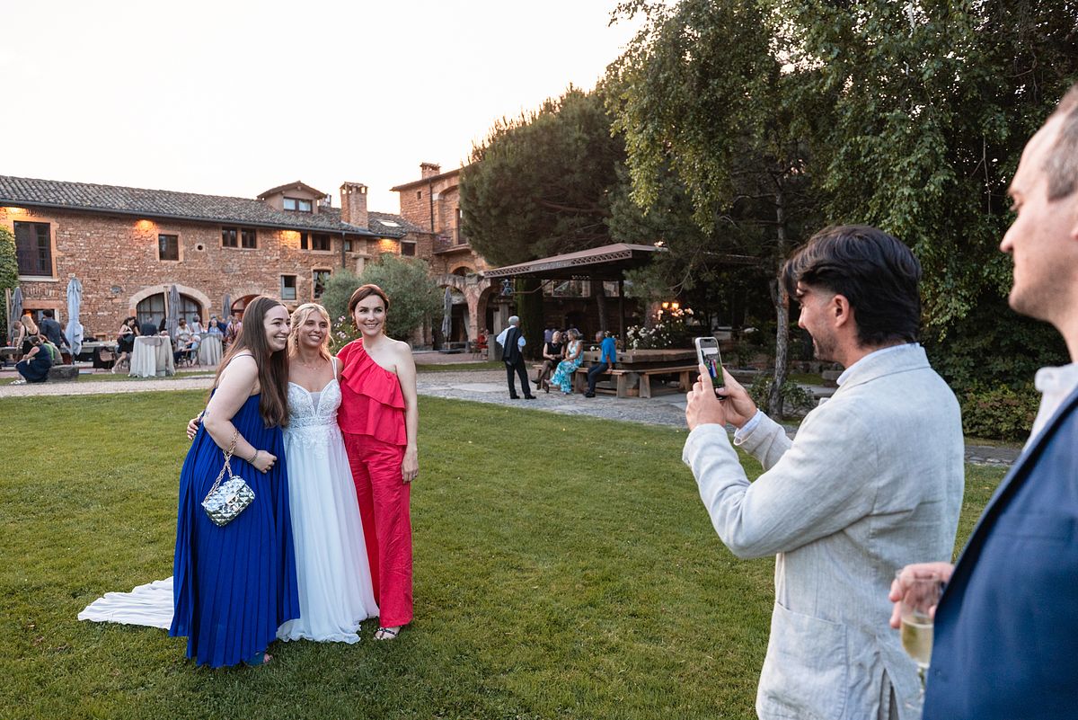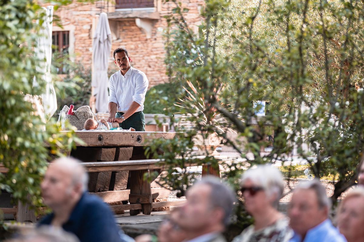 Après le “oui”, place au cocktail façon garden party sur la pelouse du domaine, avec vue sur la campagne beaujolaise. Invités installés en petits groupes, verres colorés à la main, saxophoniste qui déambule et show culinaire improvisé par les chefs : une ambiance dolce vita, élégante et conviviale, parfaite pour un reportage photo naturel et spontané.