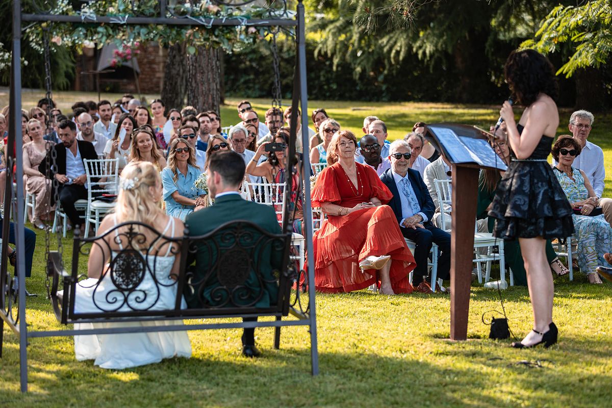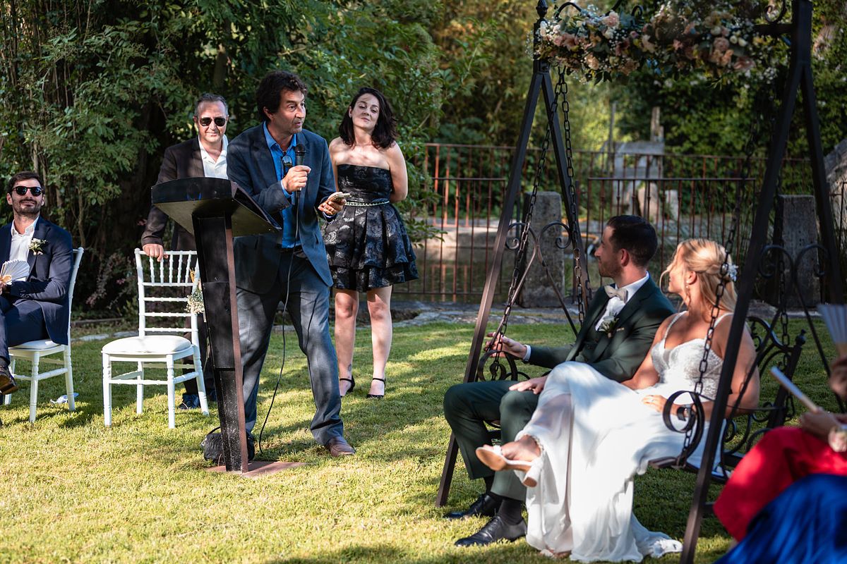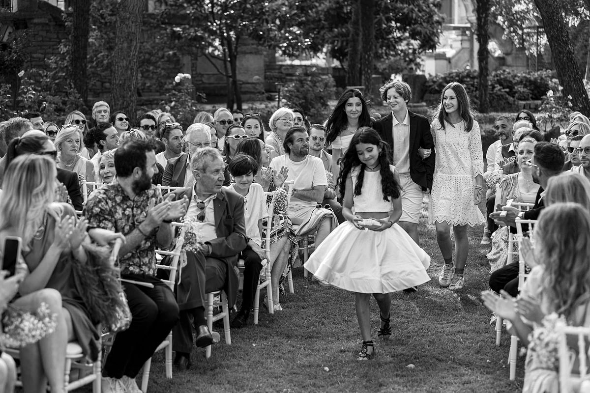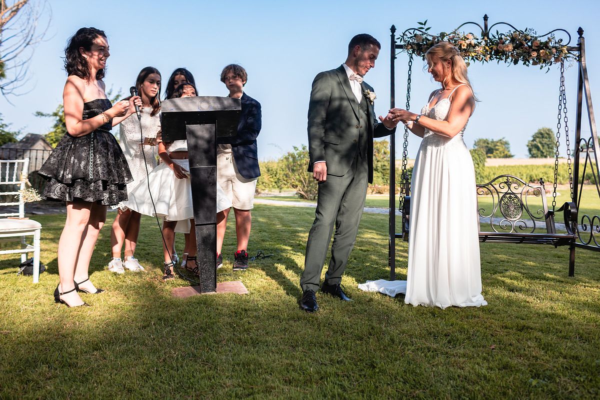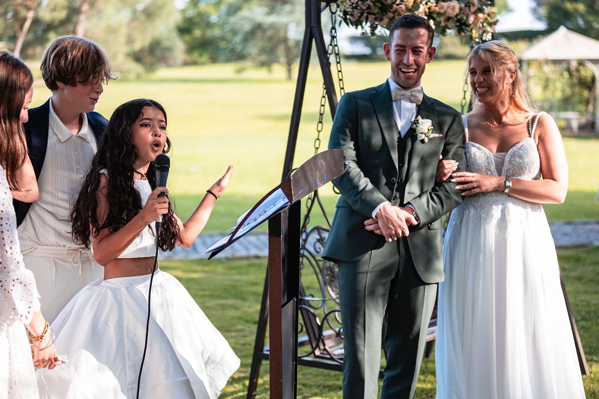 La cérémonie laïque s’est déroulée dans le parc, sous une lumière d’été et un décor floral délicat, idéal pour un mariage champêtre chic. Les discours se sont enchaînés, entre déclarations touchantes, anecdotes drôles et interventions des enfants, qui ont littéralement volé la vedette par leur sincérité et leur énergie, créant des images fortes et authentiques.