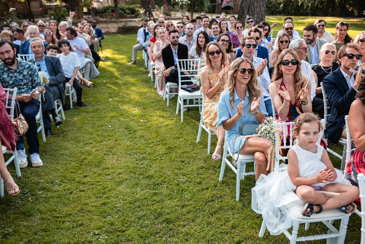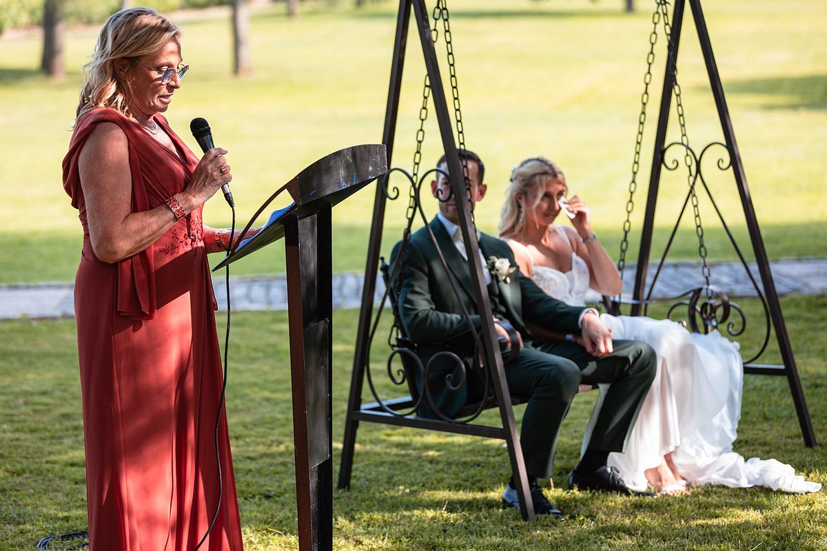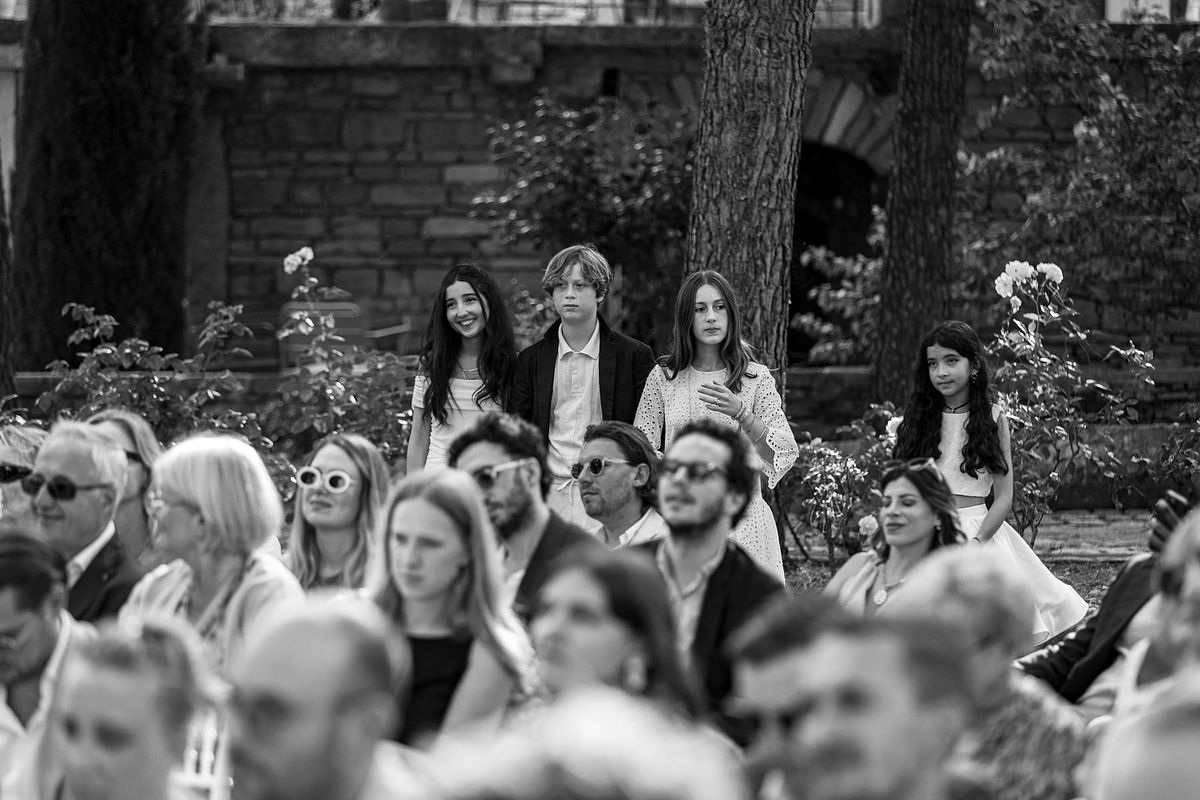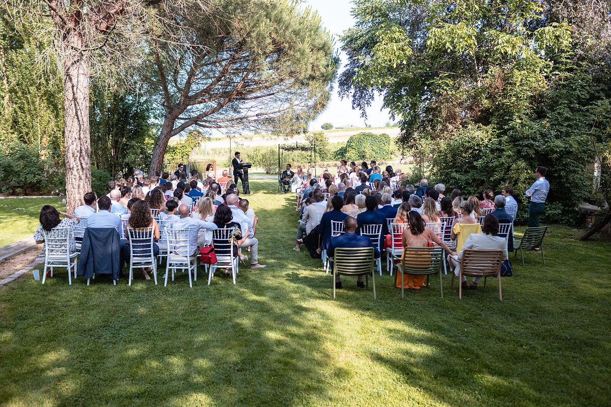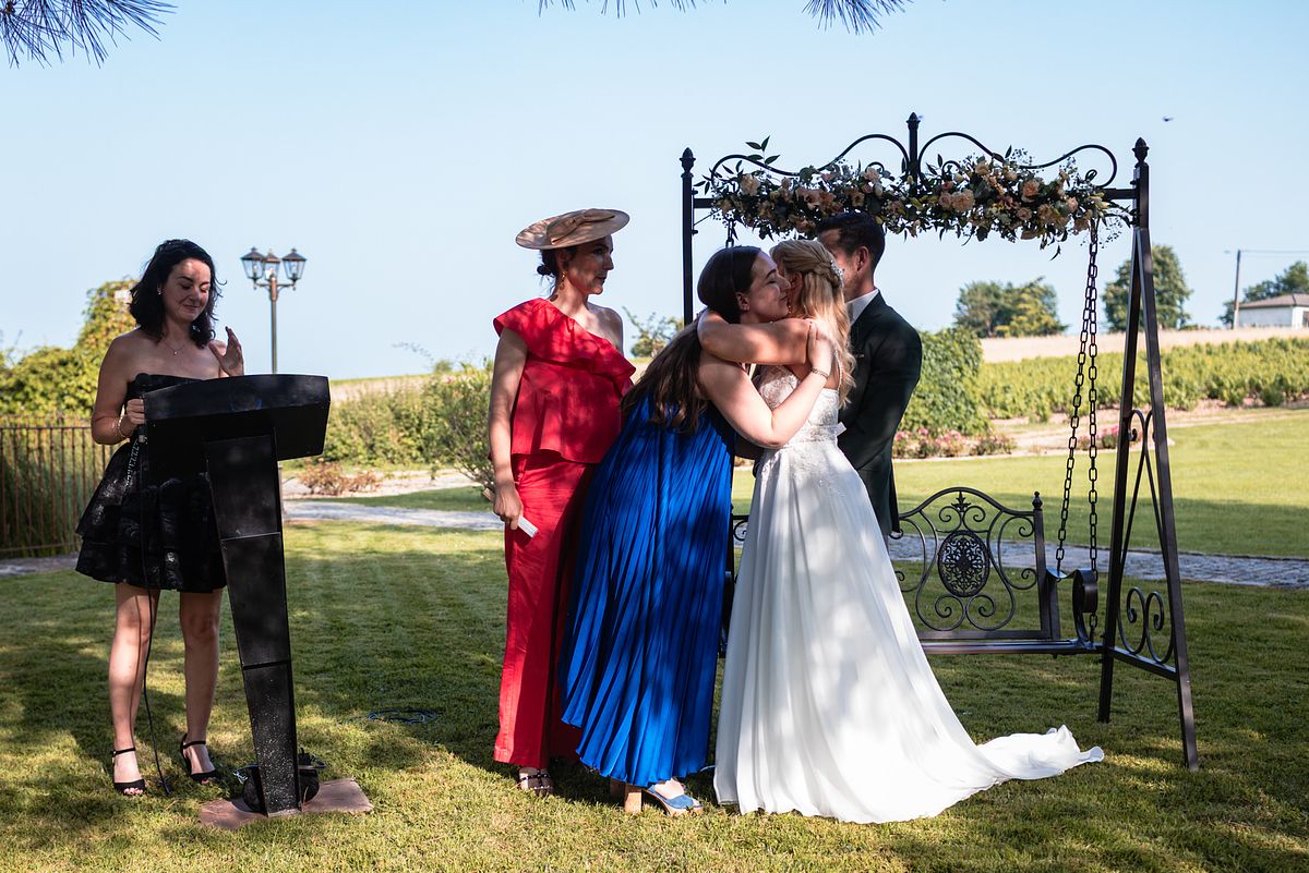 La cérémonie laïque s’est déroulée dans le parc, sous une lumière d’été et un décor floral délicat, idéal pour un mariage champêtre chic. Les discours se sont enchaînés, entre déclarations touchantes, anecdotes drôles et interventions des enfants, qui ont littéralement volé la vedette par leur sincérité et leur énergie, créant des images fortes et authentiques.