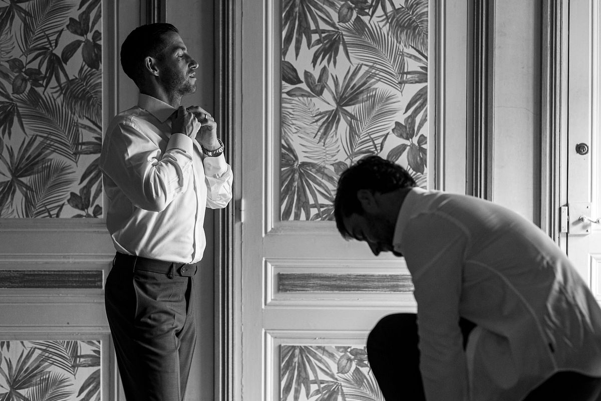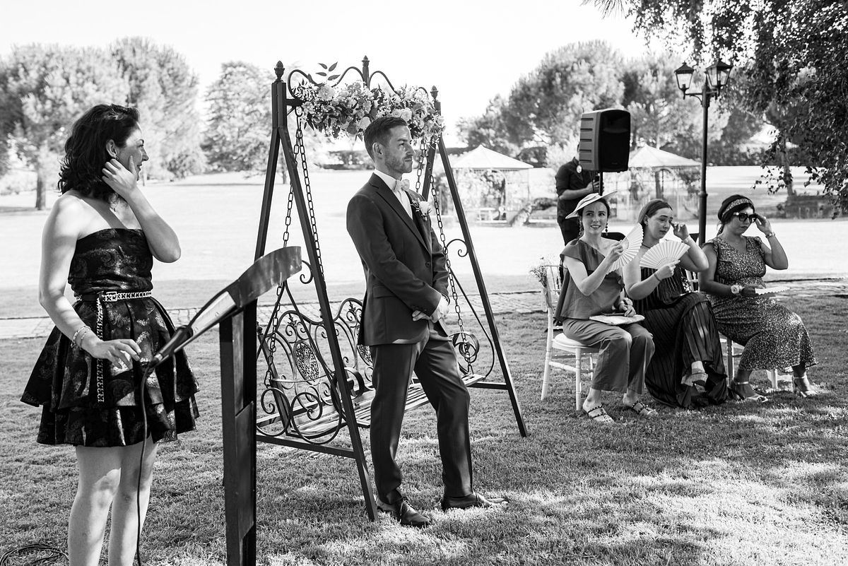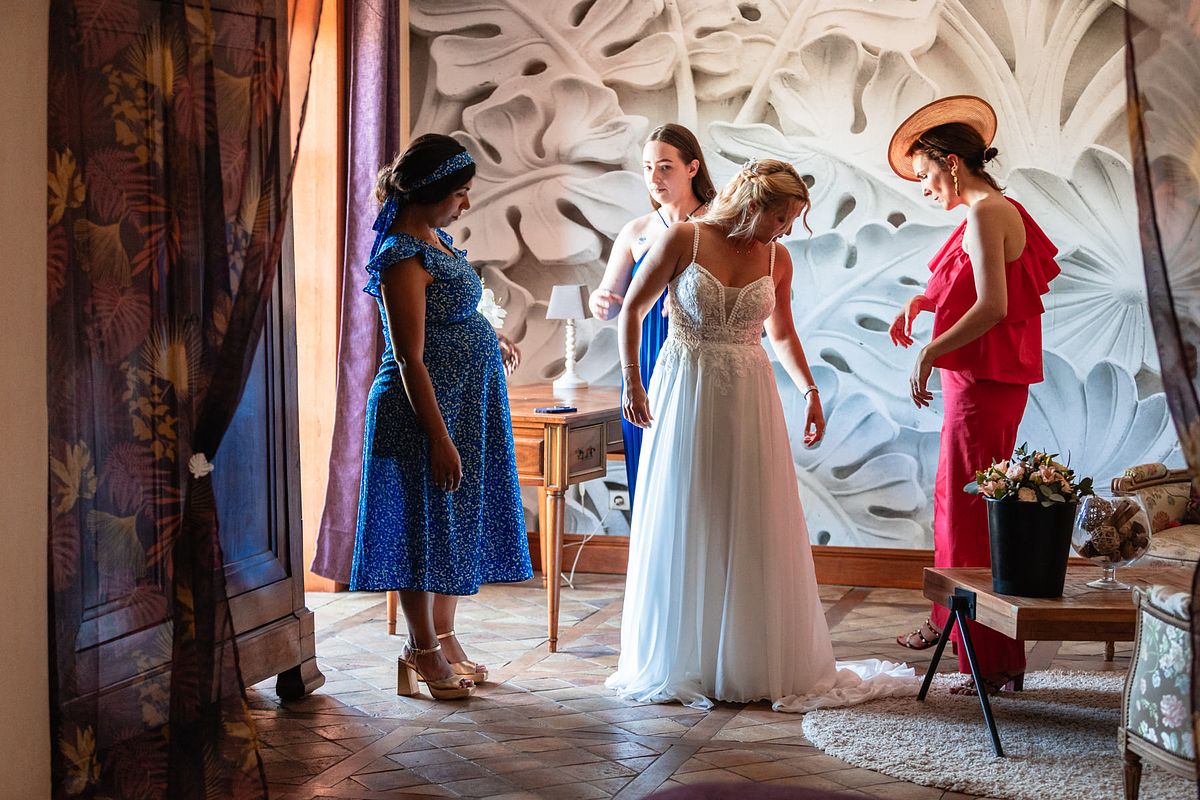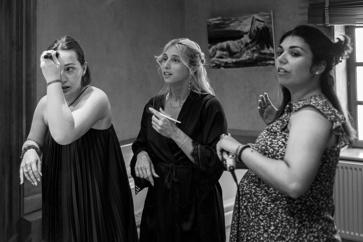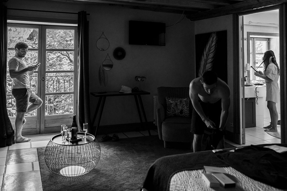 La journée a commencé dans l’intimité d’une des chambres du Domaine de la Ruisselière, où Albane s’est préparée entourée de ses témoins et amies, entre retouches de robe, fous rires et petites attentions. Pendant ce temps, Anthony s’affairait déjà dehors à organiser les derniers détails de la cérémonie laïque dans le jardin, installant les chaises blanches comme pour accueillir lui‑même chacun de leurs invités.
