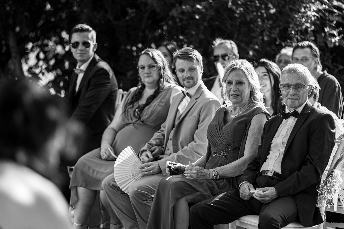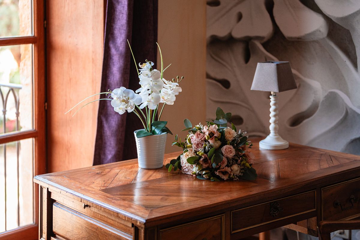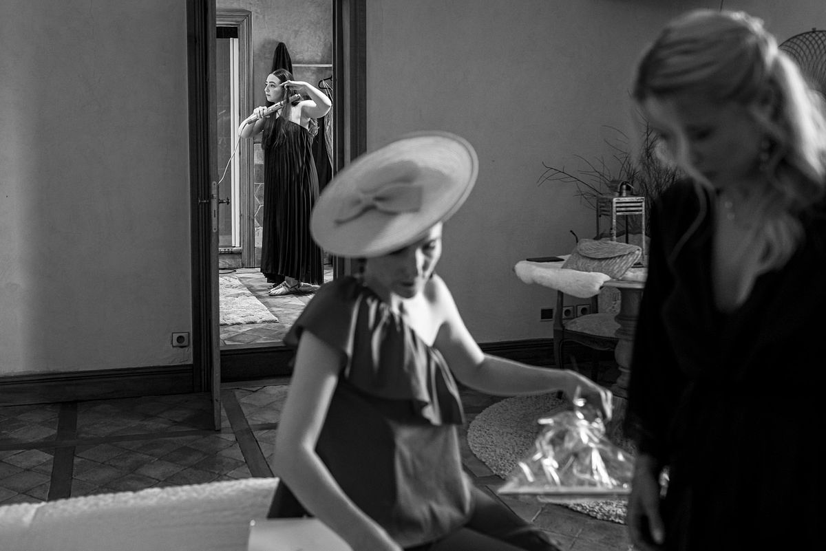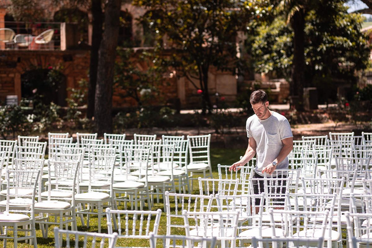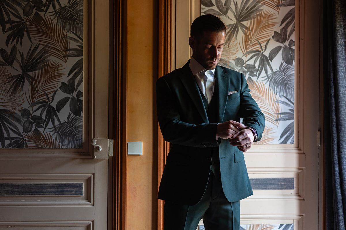 La journée a commencé dans l’intimité d’une des chambres du Domaine de la Ruisselière, où Albane s’est préparée entourée de ses témoins et amies, entre retouches de robe, fous rires et petites attentions. Pendant ce temps, Anthony s’affairait déjà dehors à organiser les derniers détails de la cérémonie laïque dans le jardin, installant les chaises blanches comme pour accueillir lui‑même chacun de leurs invités.